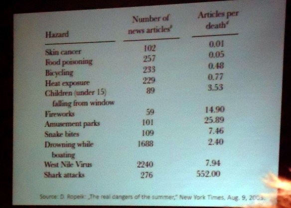 Der Artikel „Risikowahrnehmung: Wenn man vor den falschen Dingen Angst hat„, der heute im Science-Blog steht beschreibt schön die Diskrepanz zwischen gefühlter Angst und tatsächlichem Risiko. Z.B. das was die Medien aus den Risiken machen: