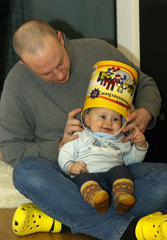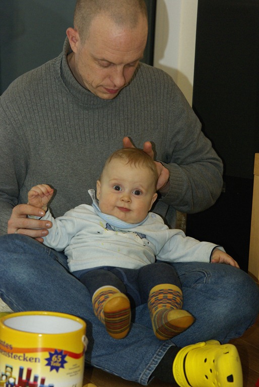 So sieht das übliche Spiel mit dem Kreisel aus. Mama startet das Ding und Felix greift ganz gezielt nach dem blauen Griff um ihn anzuheben. Ich dachte, Kinder schauen zu wie sich das Dinge zu Ende dreht.